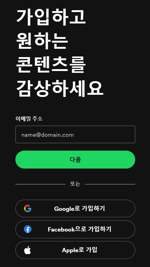 스포티파이 회원가입 방법은 무척 간단합니다. 현재 보유하고 있는 구글아이디, 페이스북 아이디, 애플 아이디로 간편하게 회원가입이 가능하며, 이메일 주소로도 회원 가입이 가능합니다.