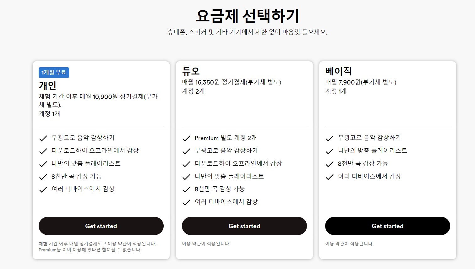 스포티파이 한국의 경우 개인, 베이직, 듀오 3가지 종류의 요금제가 있습니다. 각 요금제에 따라 서비스가 조금씩 다른데 아래 표로 자세히 설명해 드리겠습니다.
